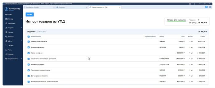 АвтоДилер Онлайн умеет обрабатывать документы поставщиков в формате XML, чтобы вы могли быстро оформить приход товаров на склад. Фича работает по аналогии с импортом из CSV-файла.